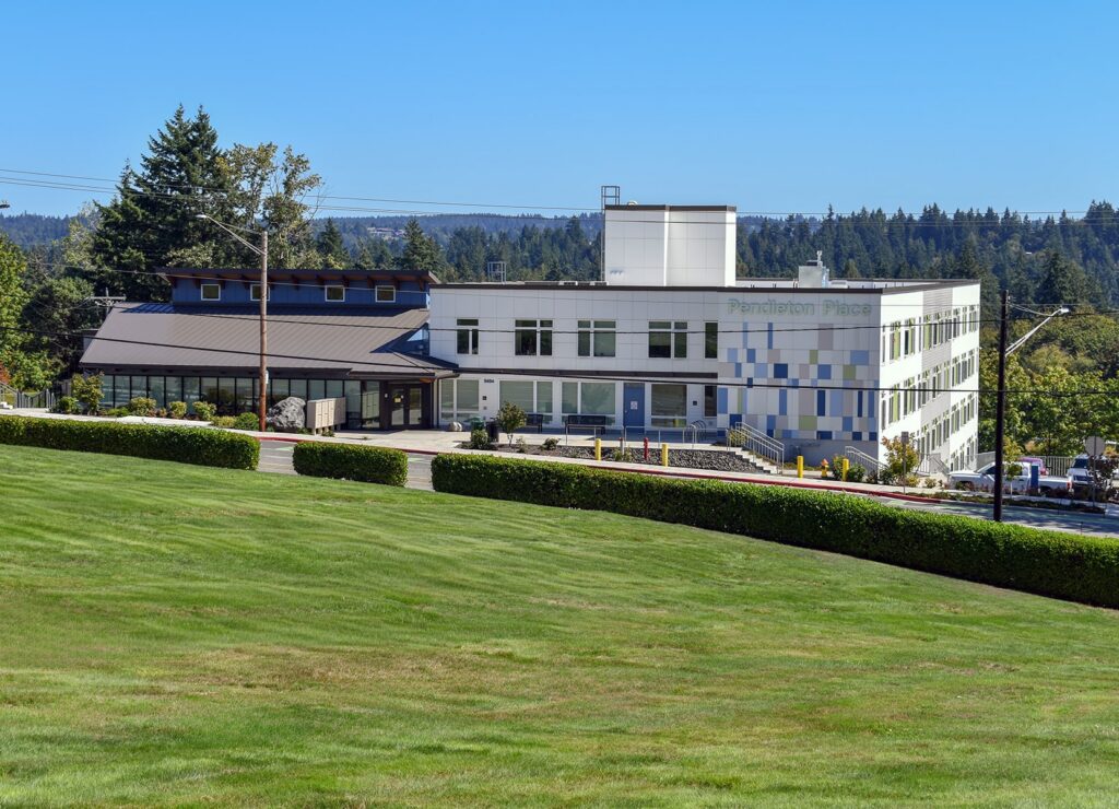 AHBL has also been involved in another innovative project operated by Kitsap Mental Health Services, Pendleton Place is a “housing first” facility for adults with chronic mental illness and substance use in a permanent supportive housing complex, bringing much-needed stability and opportunities to engage in treatment, healthcare, and employment services. With a mix of 72 one-bedroom and studio apartments, residents also have access to a communal area, computer lab, and on-site medical treatment, as well as substance use treatment services and employment assistance. The facility sits on a steeply sloped 1.66 acres, with 50 vertical feet of elevation change across the site. Our team provided civil engineering and landscape architecture, addressing challenging stormwater control on the steep site. The facility was funded through a combination of low-income housing tax credits, a Bill and Melinda Gates Foundation award, the Bremerton Housing Authority, and Federal and State funds, grants, and matches.