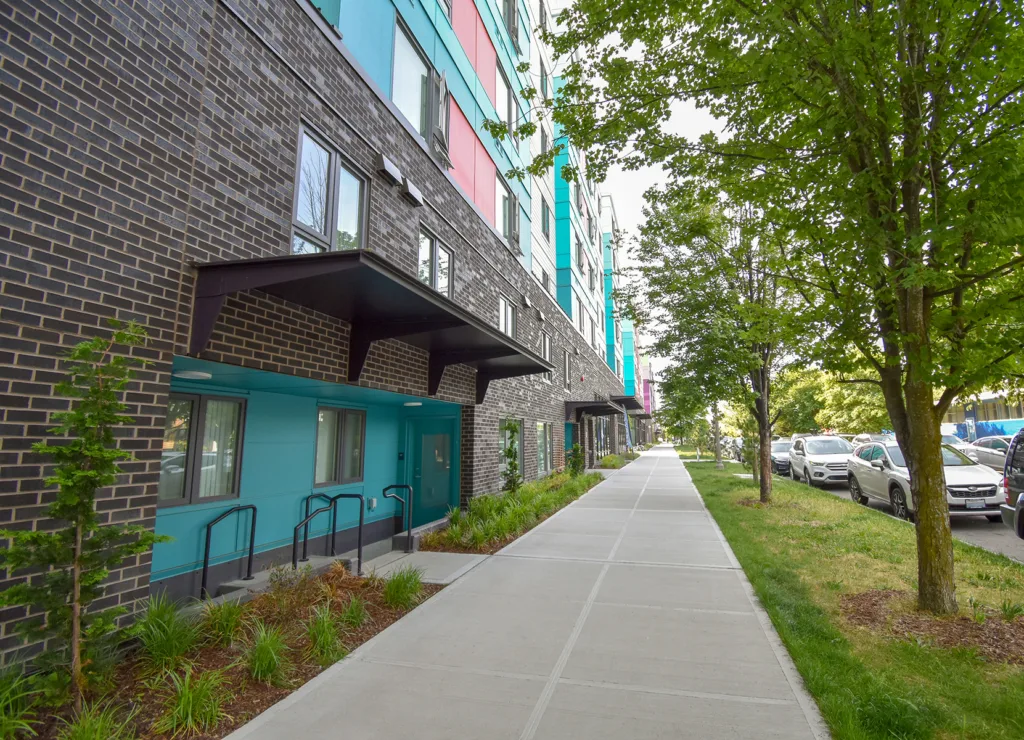 In Tacoma’s Hilltop neighborhood, the Tacoma Housing Authority’s Hilltop Housing project aims to revitalize the area with two mixed-use buildings providing 231 affordable housing units. AHBL’s landscape architecture team collaborated with the design team to incorporate new tree code requirements and meet the community’s needs for greenspace, recreation, and health. The project includes courtyards with existing street trees and new plantings to create a welcoming environment.