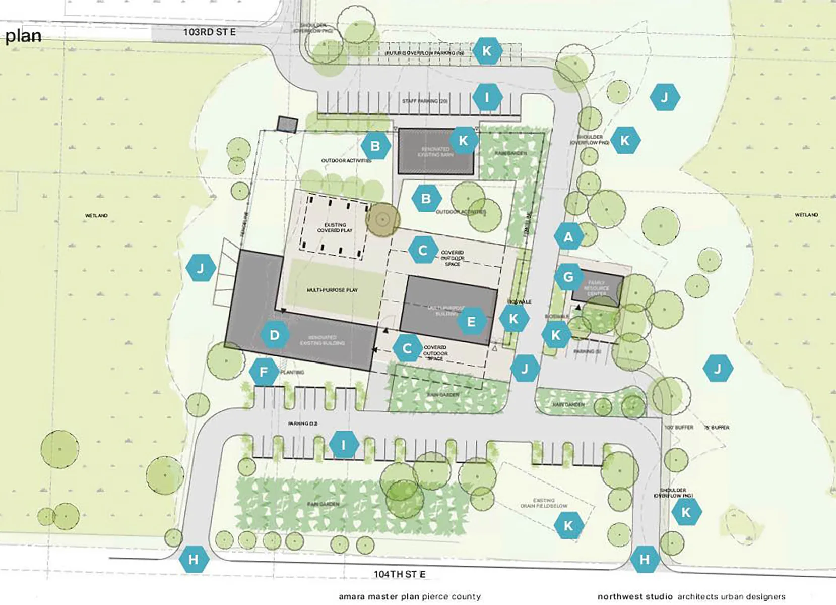 Amara acquired 29 acres in the Summit‑Waller area of unincorporated Pierce County to develop resources for children and families impacted by foster care, family separation, and related trauma. AHBL led the master planning effort, developing multiple feasible plan alternatives in close collaboration with Amara. The team evaluated opportunities for walkways and trails that support nature exploration and education while protecting designated wetlands, and planned outdoor classroom spaces and staging areas with weather protection for summer and after‑school programming, including wilderness training and camping. The master plan also incorporated Amara’s vision for an indoor‑outdoor flexible multi‑use building accommodating groups of 20–250 for programmatic use and special events, as well as designated areas for small‑scale farming compatible with wetland conditions, including irrigation needs, water sources, greenhouse and hoop‑house areas, and adjacent sheltered educational spaces.