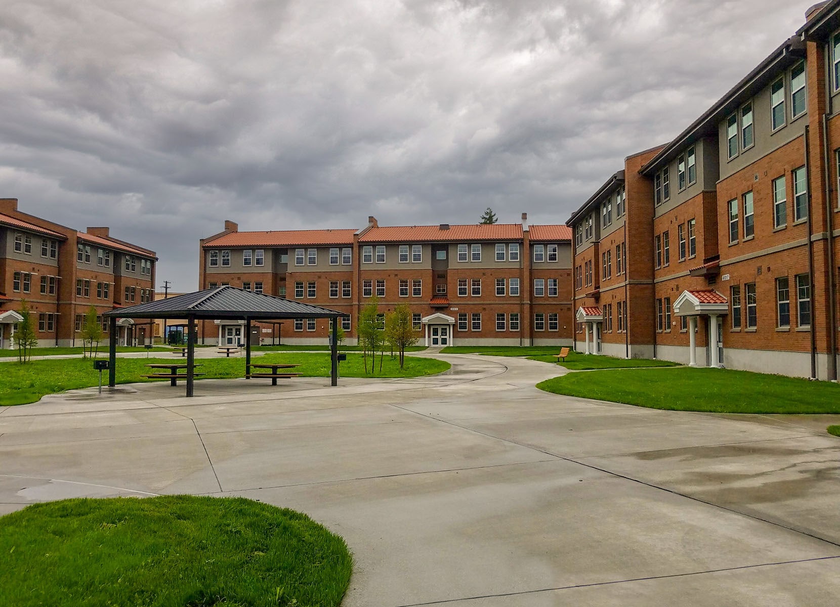 AHBL delivered comprehensive civil engineering, structural engineering, landscape architecture, and land surveying services for a design-build project comprising four three-story buildings totaling approximately 109,000 square feet. The facilities, built to support 324 soldiers, were designed for a 50-year lifespan and targeted LEED Silver certification. The structures featured structural steel floors and insulated concrete form shear walls to enhance energy efficiency. Civil engineering site development included utilities and connections for lighting, paving, walkways, curbs, storm drainage, signage, and information systems. Utility connections included domestic water, fire protection water, sanitary sewer, gas, power, and communication lines. Structural engineers incorporated progressive collapse design and used Building Information Modeling software for clash detection and improved 3D design coordination. Landscape design emphasized low-maintenance, drought-tolerant plantings integrated into parking areas, courtyards, and the broader base campus.