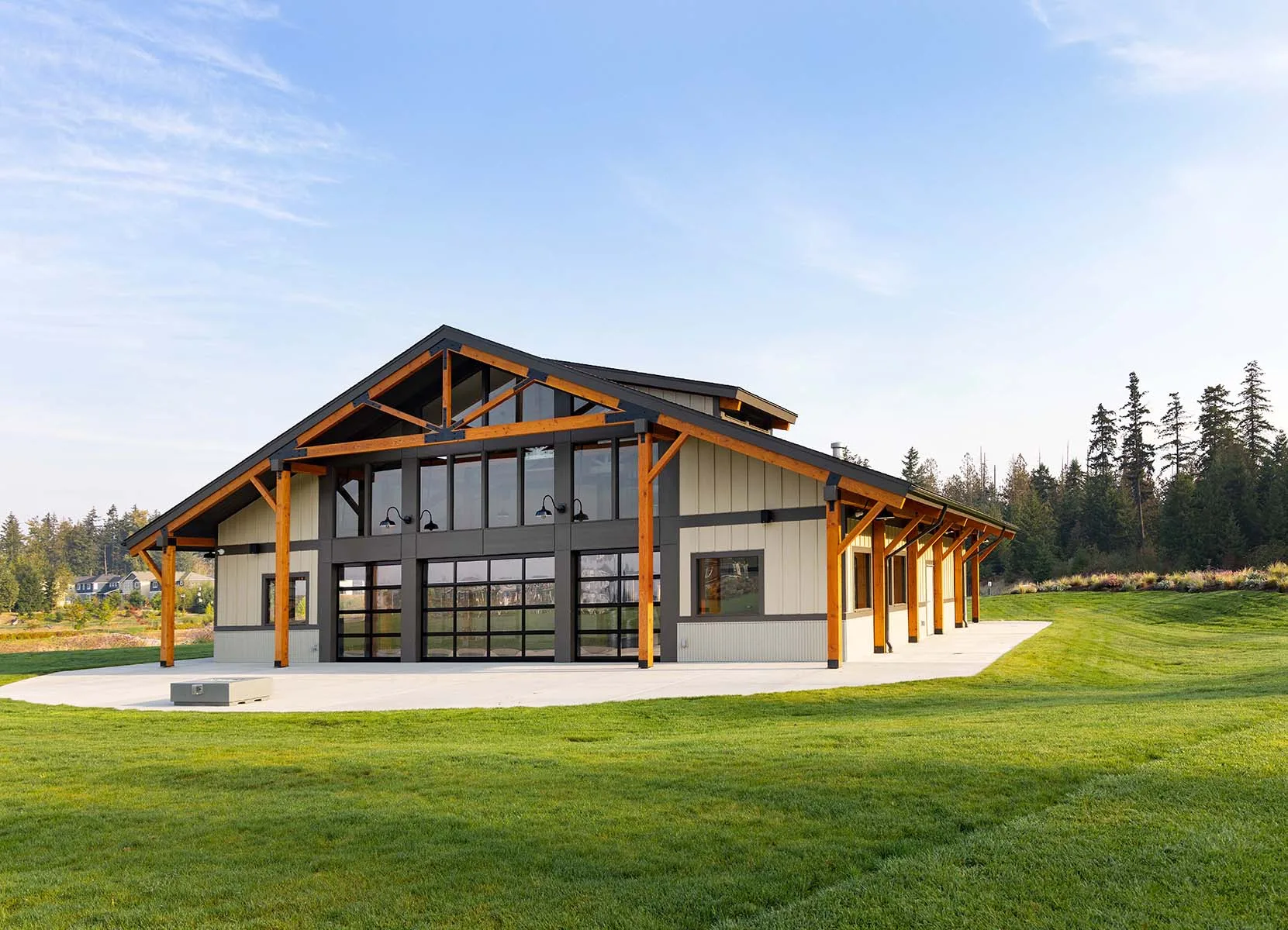 The building features exposed heavy‑timber framing with steel plate connections, indoor/outdoor accessible restrooms, a reception hall, two multi‑purpose rooms, storage areas, a mechanical mezzanine, and an expansive roof overhang that extends usable outdoor space. A large event area at the rear incorporates three oversized garage doors opening onto a concrete pad to support flexible indoor‑outdoor programming.