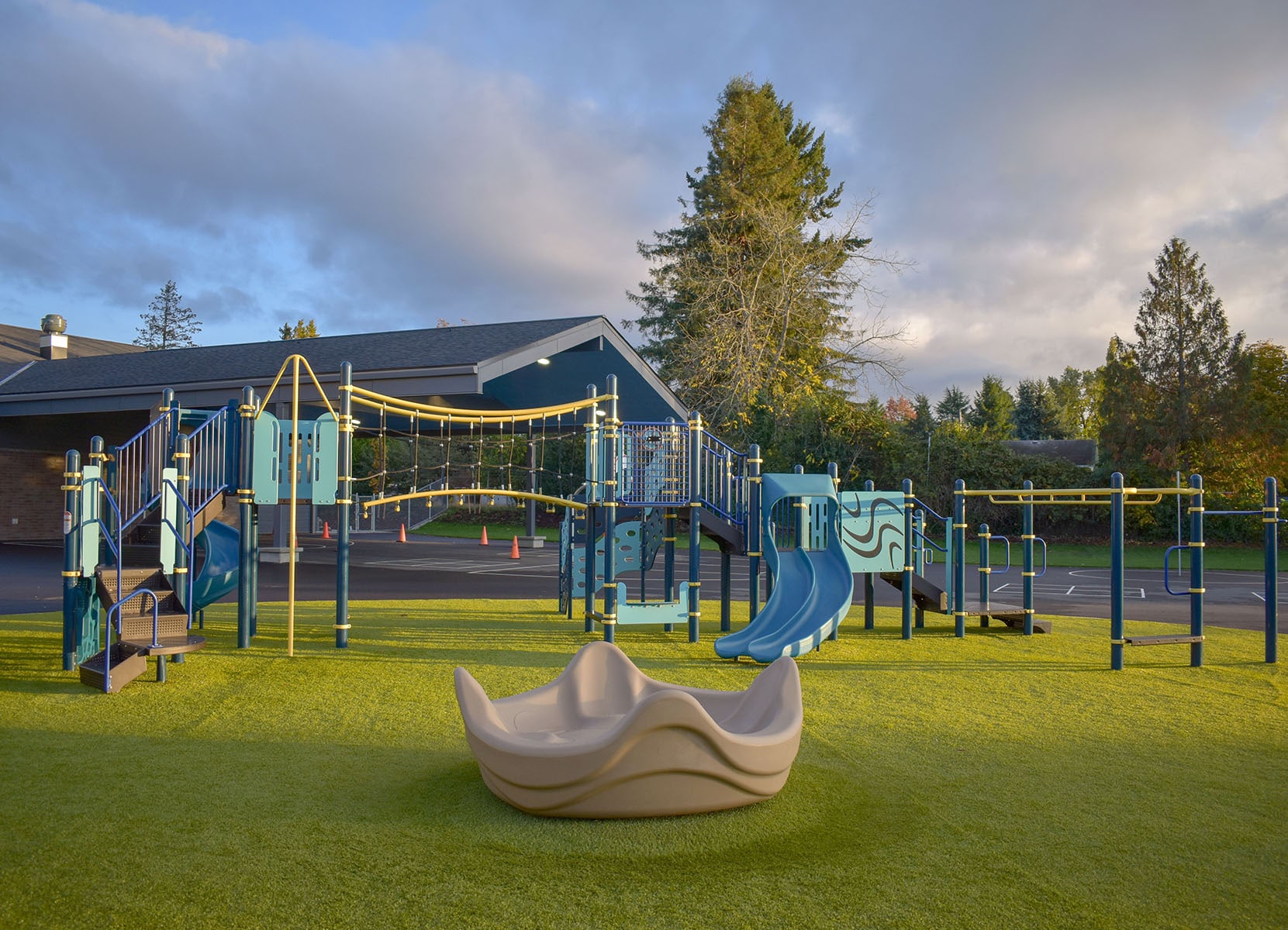 Landscape architects led site planning, including pedestrian access, traffic flow, and playground design. Mid-project, the team adapted plans to incorporate a synthetic turf playfield. Surveyors provided a comprehensive topographic and boundary survey to guide development. Together, these efforts delivered a modern, accessible learning environment tailored to the site’s unique constraints.