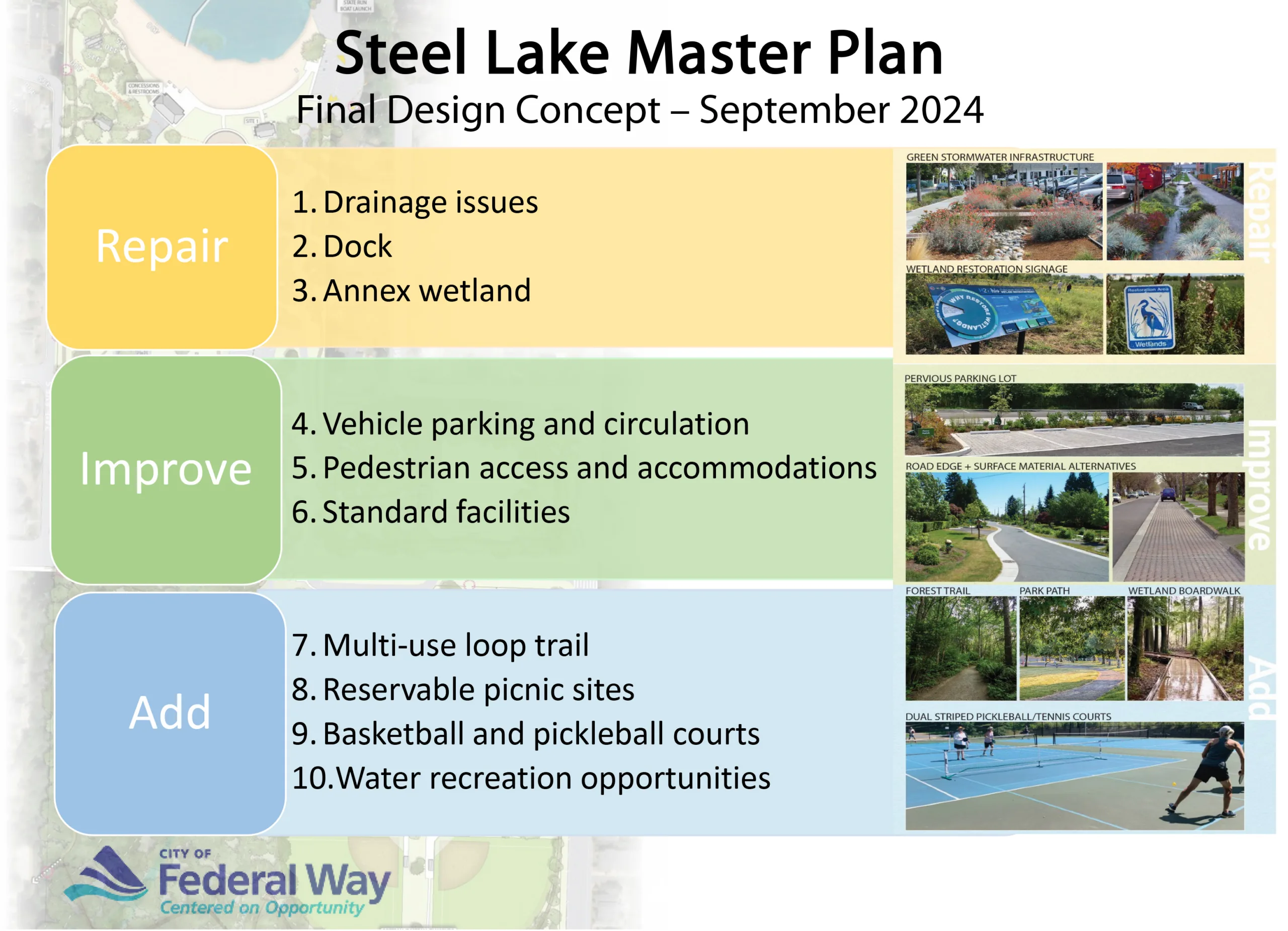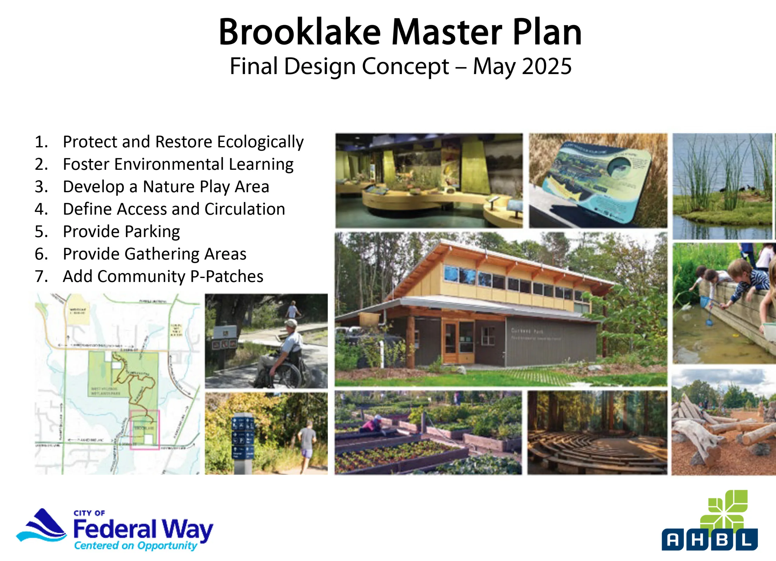 AHBL worked with the City of Federal Way to develop master plans for two parks within the Federal Way parks system: the 5-acre Brooklake historic community center and the 52-acre Steel Lake Park, which includes a beach area, walking trails, playground, concessions, and other amenities. AHBL provided design, public engagement, and project management support to identify and prioritize future site improvements based on existing conditions, City needs, and community feedback.