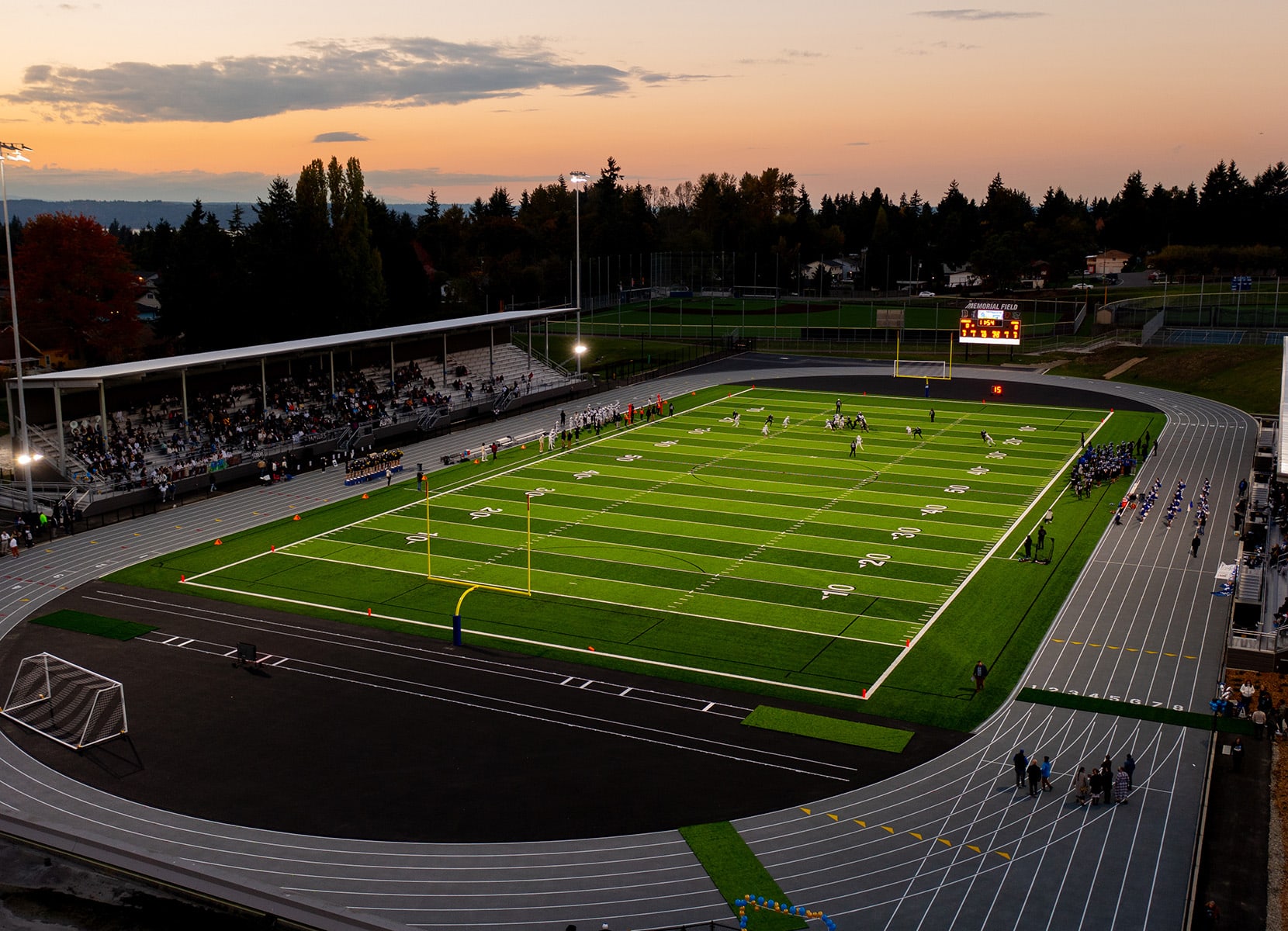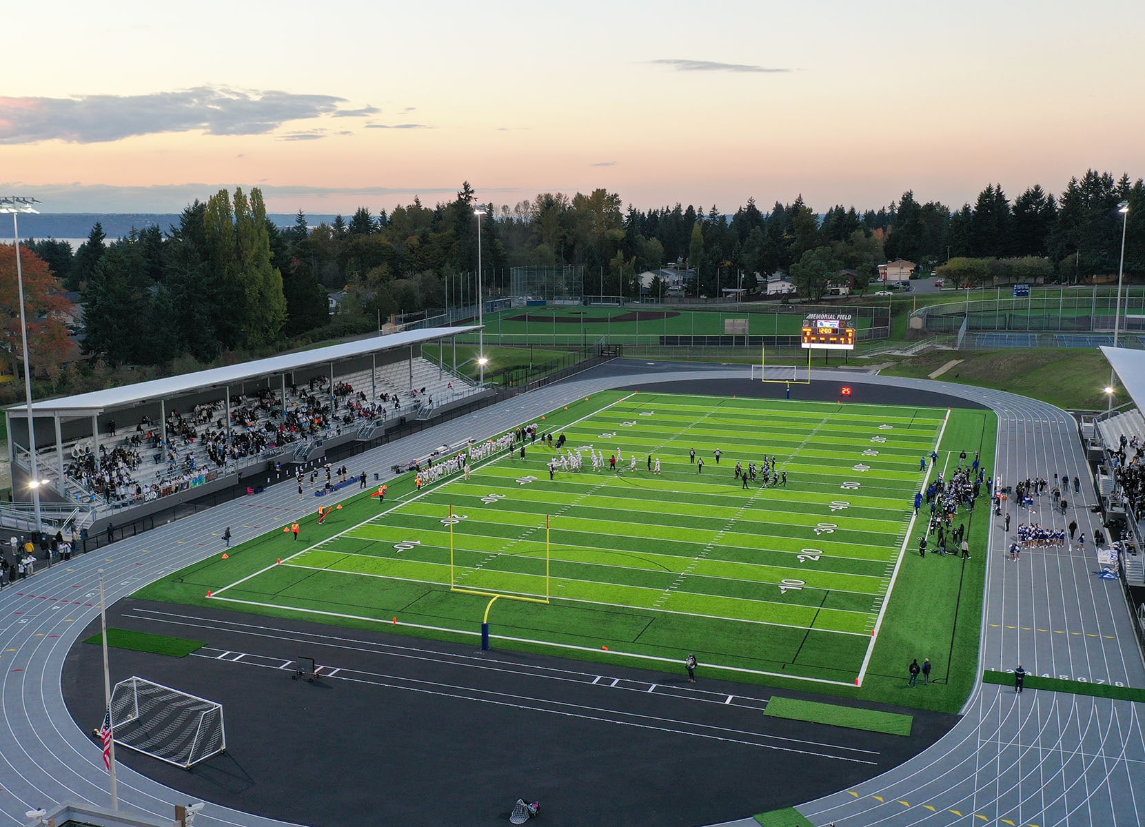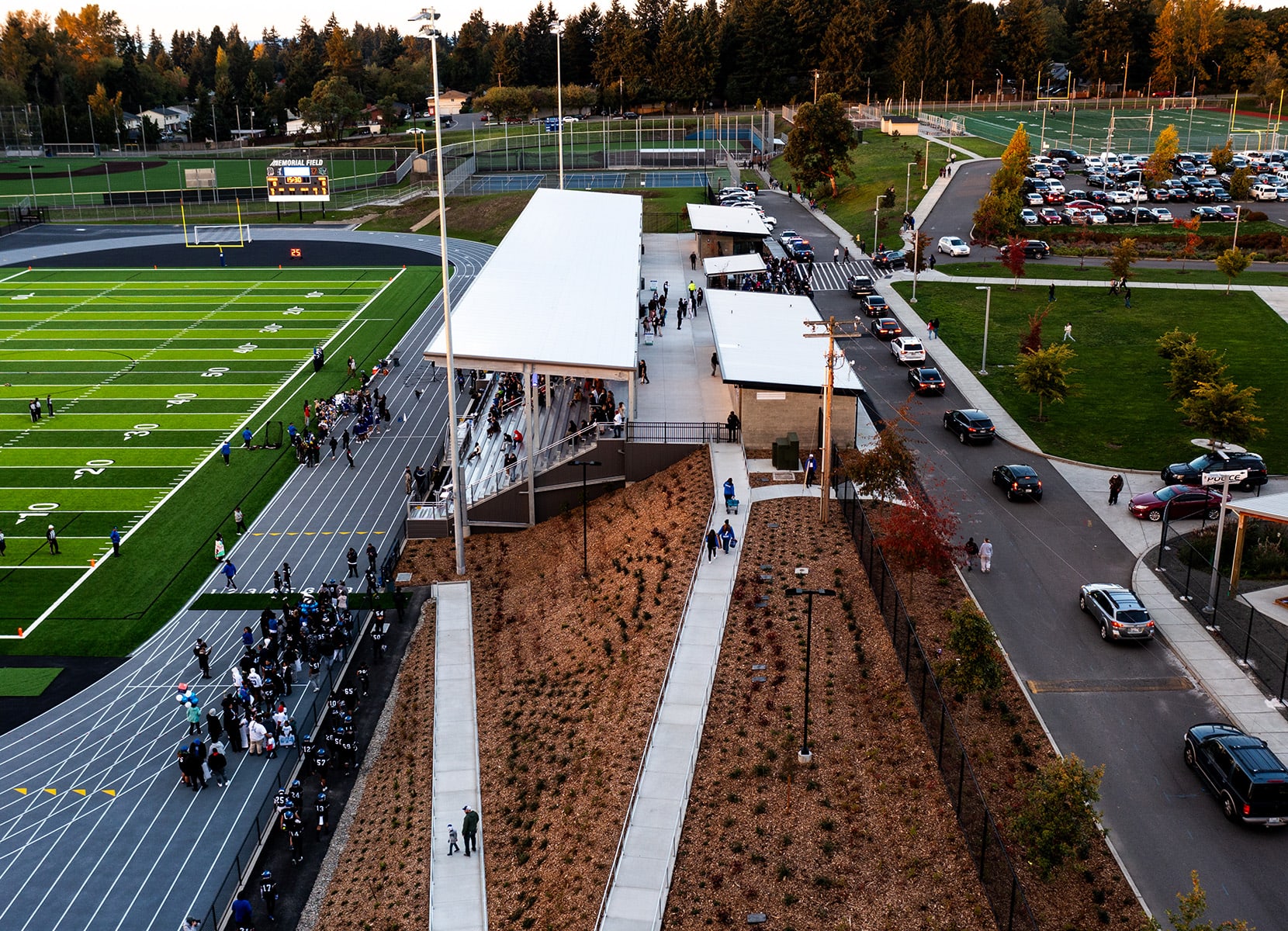 Federal Way Public Schools (FWPS) Memorial field serves all FWPS high school and middle school athletics, elementary school track, and is an open space for community members to walk the track or reserve the facility for organized events. The aging 50-year-old field did not have seating capacity for future growth, and there were security concerns from undefined boundaries between home and away spectators. Security concerns were resolved by creating two new separate covered grandstands to host up to 4,000 spectators and adding security fencing to the field itself and within each of the grandstands.