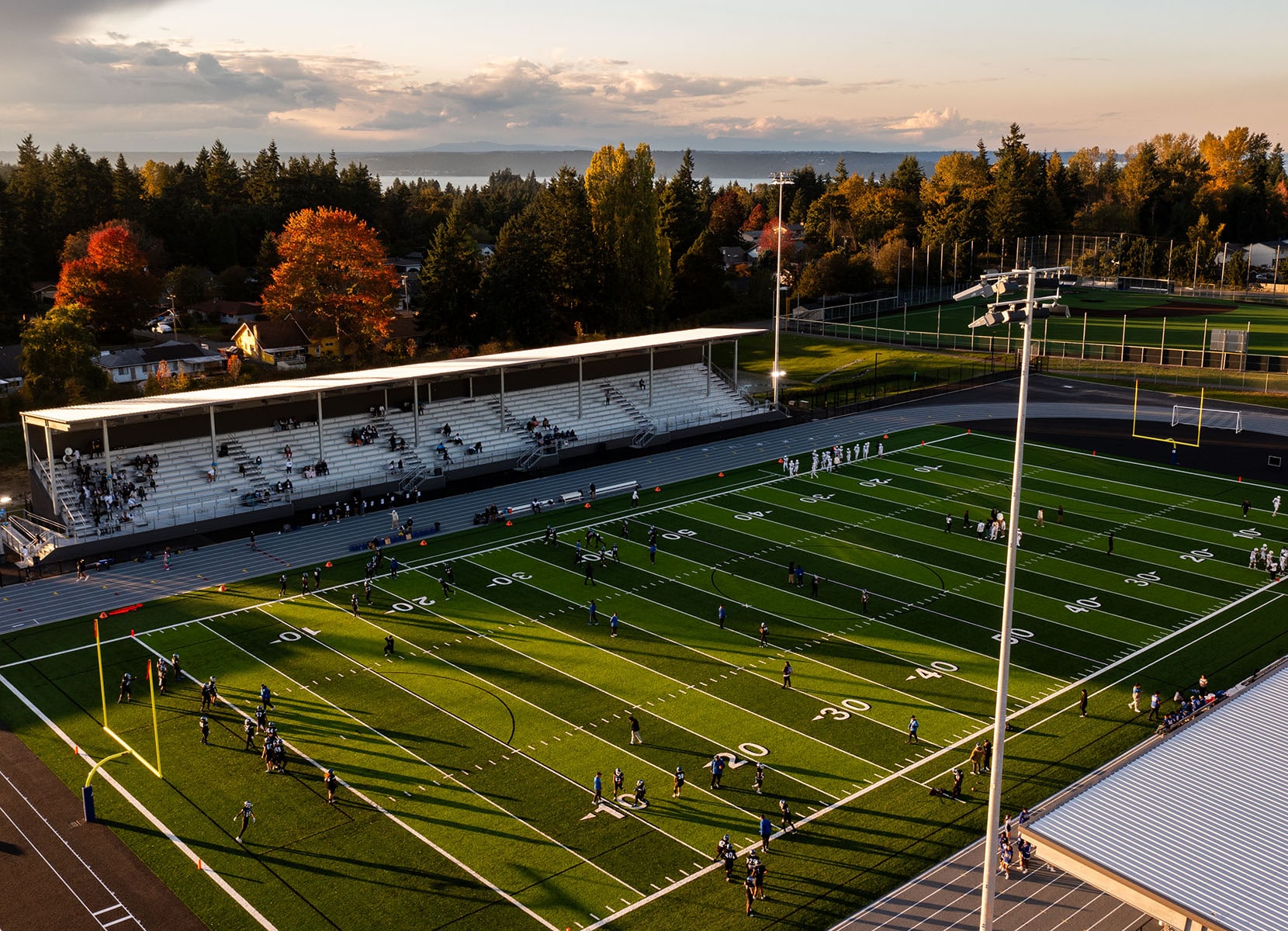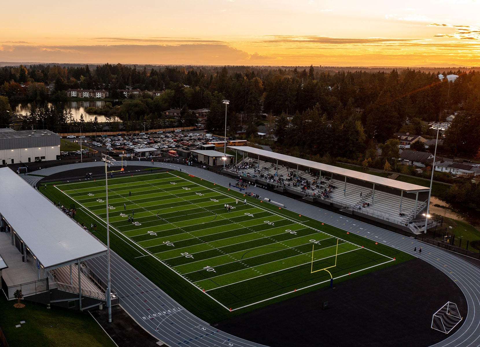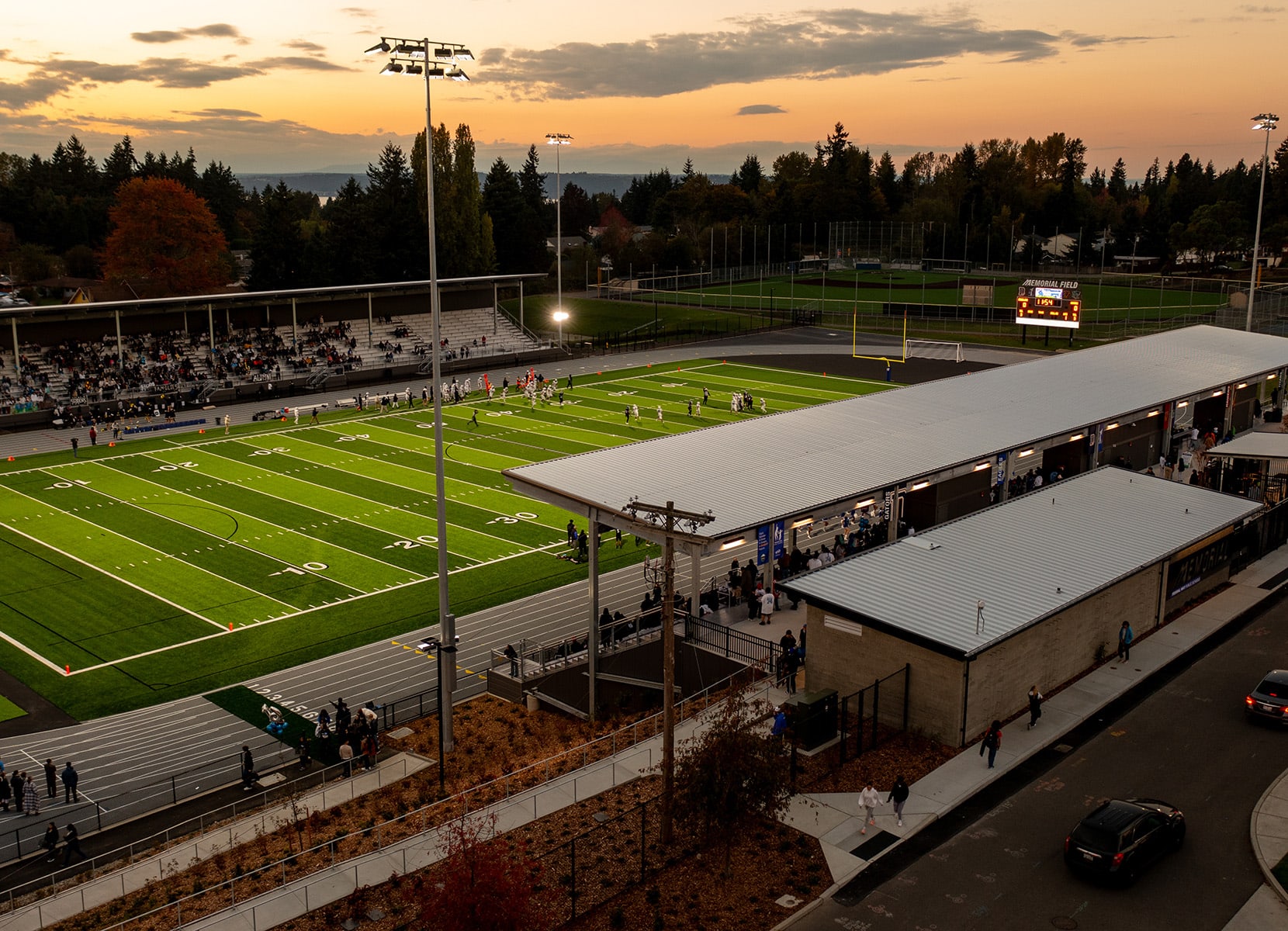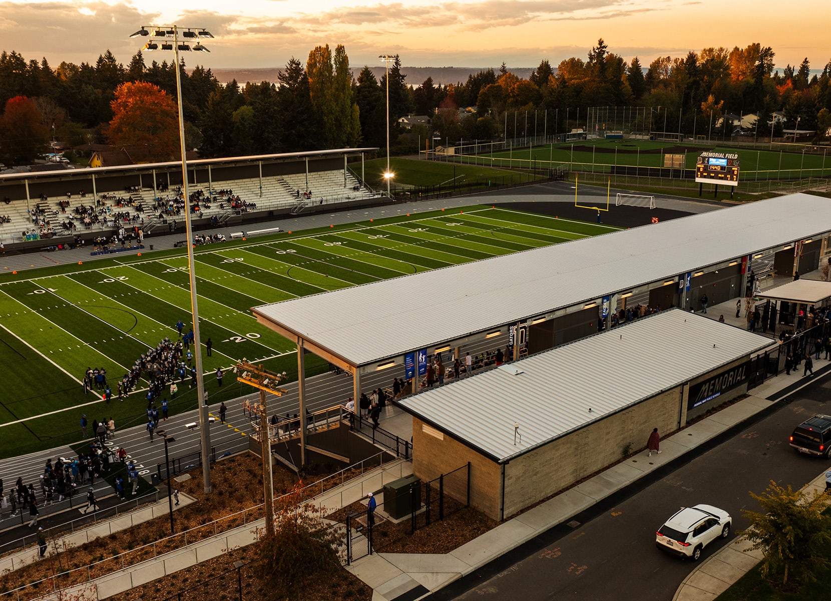 Federal Way Public Schools (FWPS) Memorial field serves all FWPS high school and middle school athletics, elementary school track, and is an open space for community members to walk the track or reserve the facility for organized events. The aging 50-year-old field did not have seating capacity for future growth, and there were security concerns from undefined boundaries between home and away spectators. Security concerns were resolved by creating two new separate covered grandstands to host up to 4,000 spectators and adding security fencing to the field itself and within each of the grandstands.