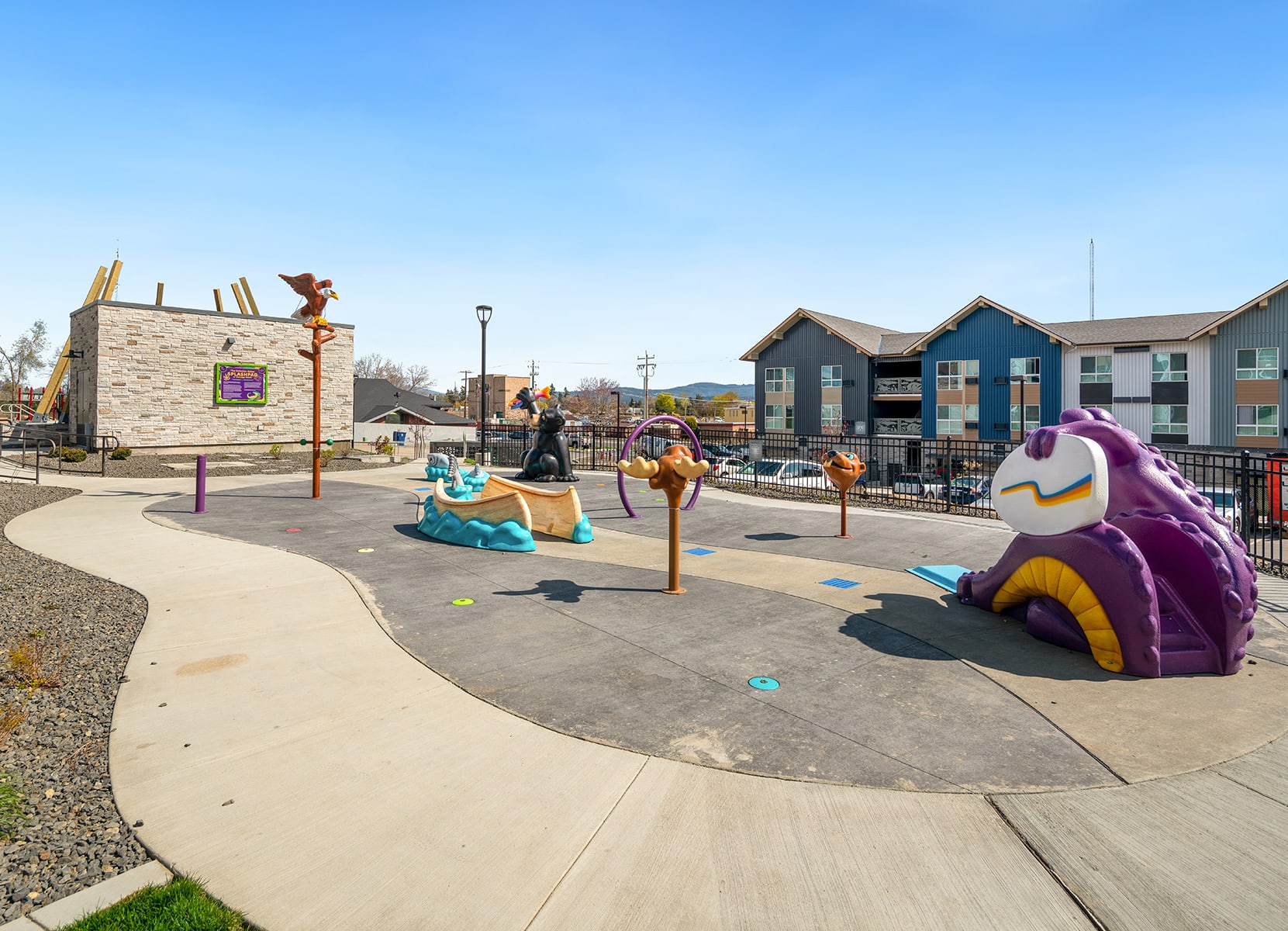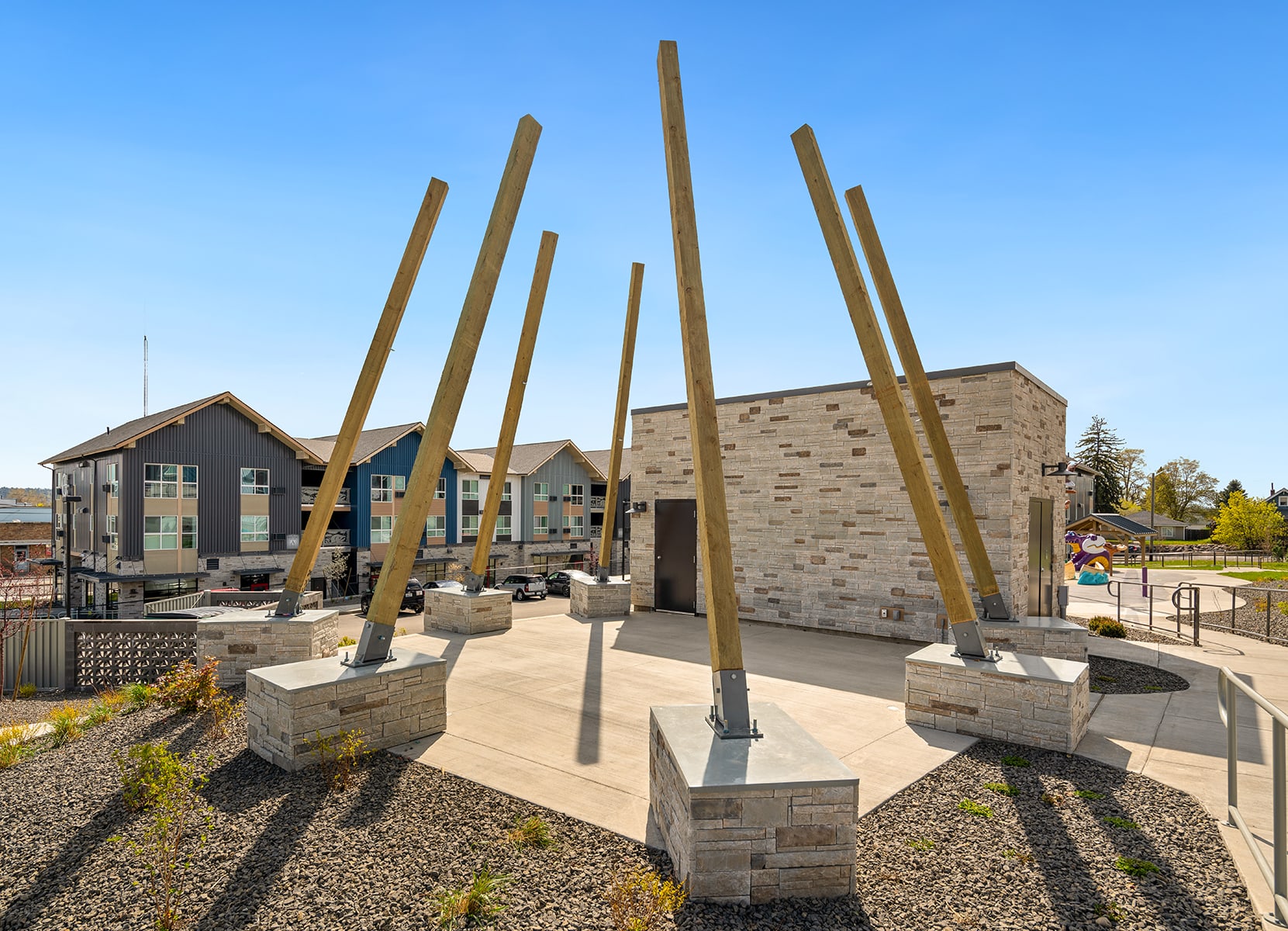 Gonzaga Family Haven provides permanent housing and wraparound support for families experiencing homelessness, serving 73 families in a safe, stable, and enriching environment. Developed by Catholic Charities in partnership with Gonzaga University and Gonzaga Preparatory School, the community features green space, a splash pad, a community garden, and on-site services such as case management, mental health counseling, and Head Start programming. AHBL played a critical role in the project’s success by delivering civil engineering and site design solutions that addressed steep grades, existing public utilities, and limited space for emergency access. Their team refined building layouts, pedestrian pathways, and grading strategies, and negotiated a creative easement to meet fire code requirements without compromising the site’s livability. Conveniently located near schools, parks, and public transit, Gonzaga Family Haven has been recognized as “a great model” for the nation by U.S. Senator Maria Cantwell.