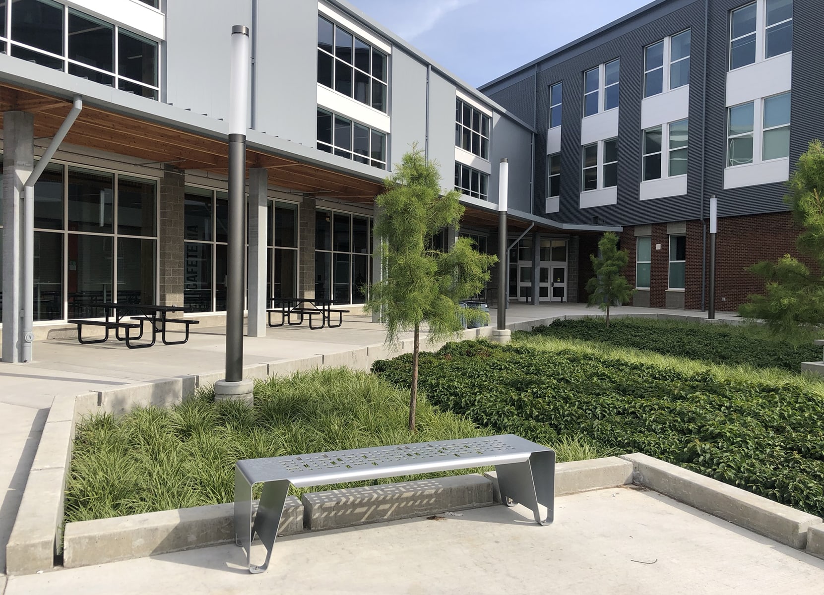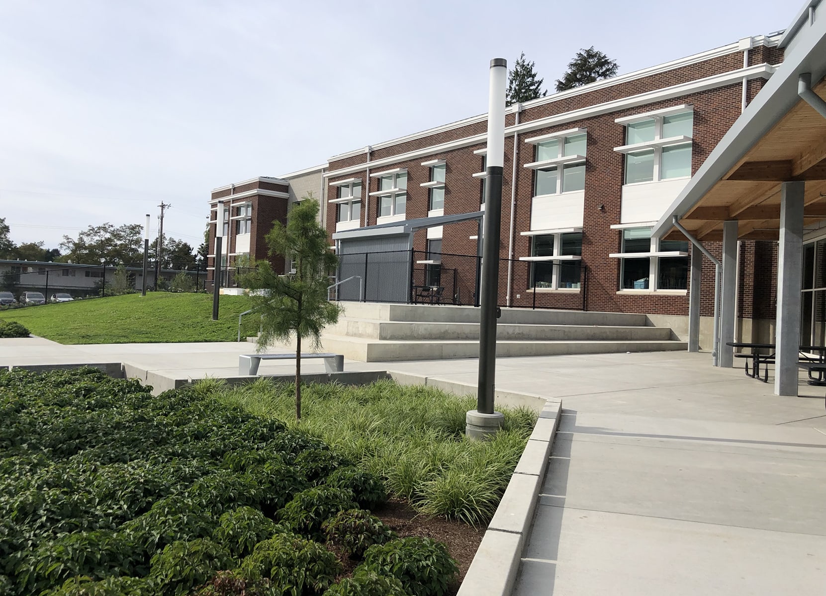 AHBL provided extensive landscape architecture services for the renovation of Highline High School. Landscape site development included site access, parking, internal vehicular circulation, plazas, pathways, lawn and planting areas, landscape-based stormwater treatment areas, and street frontage improvements. Key goals were creating accessible pathways, dynamic entry and gathering spaces, informal recreation and dining areas, three outdoor learning areas, aesthetic appeal with diverse materials, ample parking, strong community connections, and sustainable stormwater solutions.