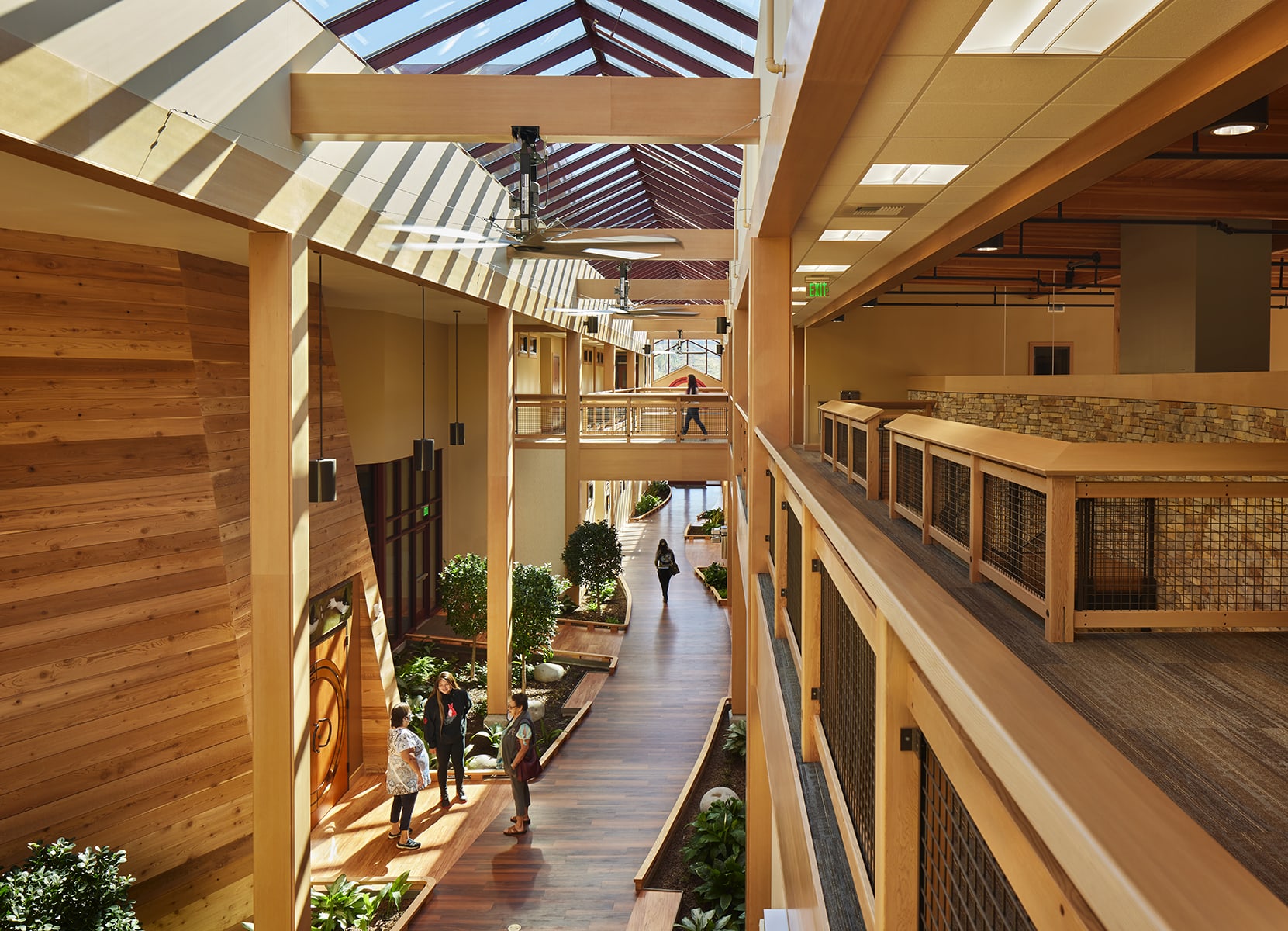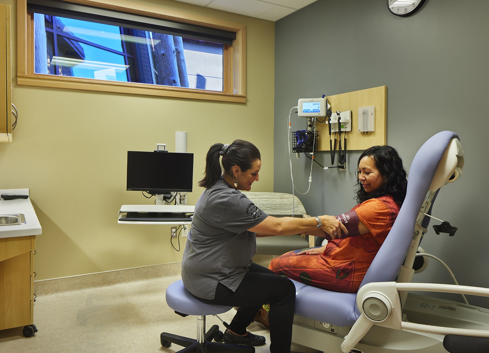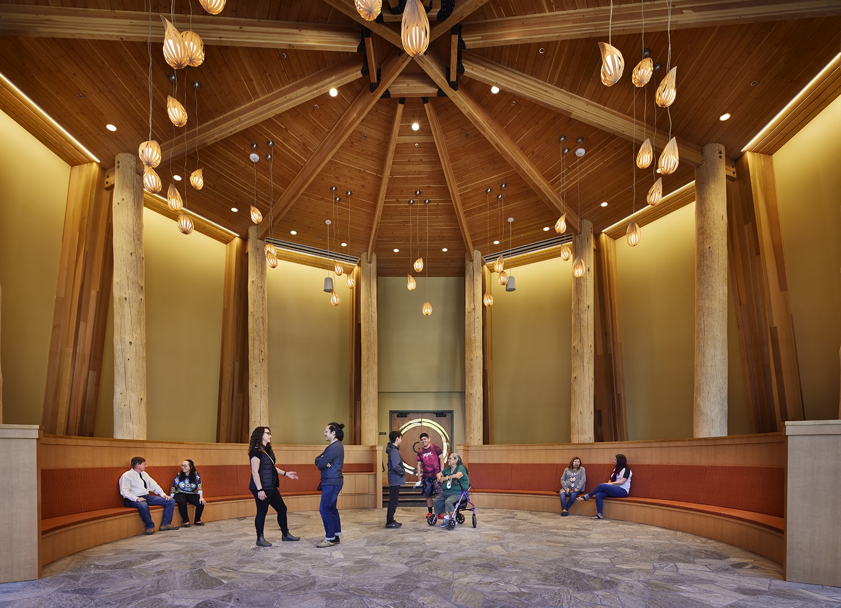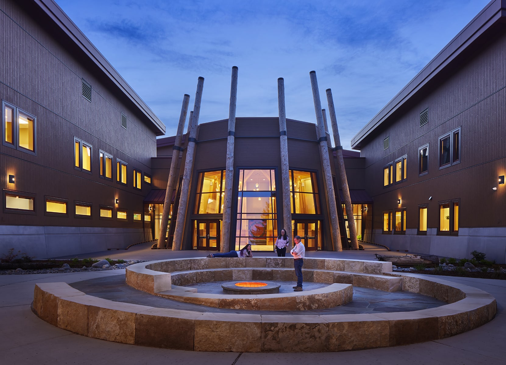The modern facility houses comprehensive medical services such as a contemporary medical clinic, an alternative medical clinic including traditional native healing practices, a dental clinic, and a behavioral health counseling clinic among other spaces. The building is comprised of 47,700 SF medical office space on two floors and 2,500 SF of future tenant space. The building’s design subtly instills healing and calmness among patients and staff using biophilic principles throughout the building. Natural light streams in through generous skylights along long interior corridors. Additionally, the deeply rooted “Healing Circle” indigenous practice and its guiding principles of spiritual, physical, mental, and emotional health are showcased through the building’s architecture and intentional programming.