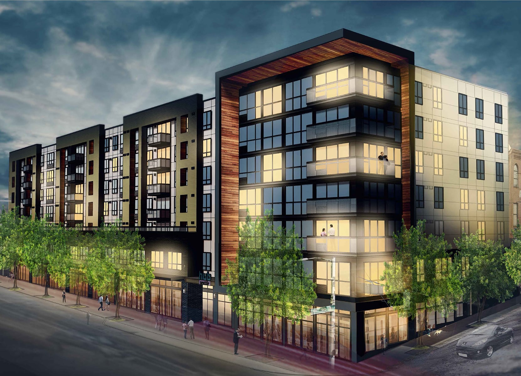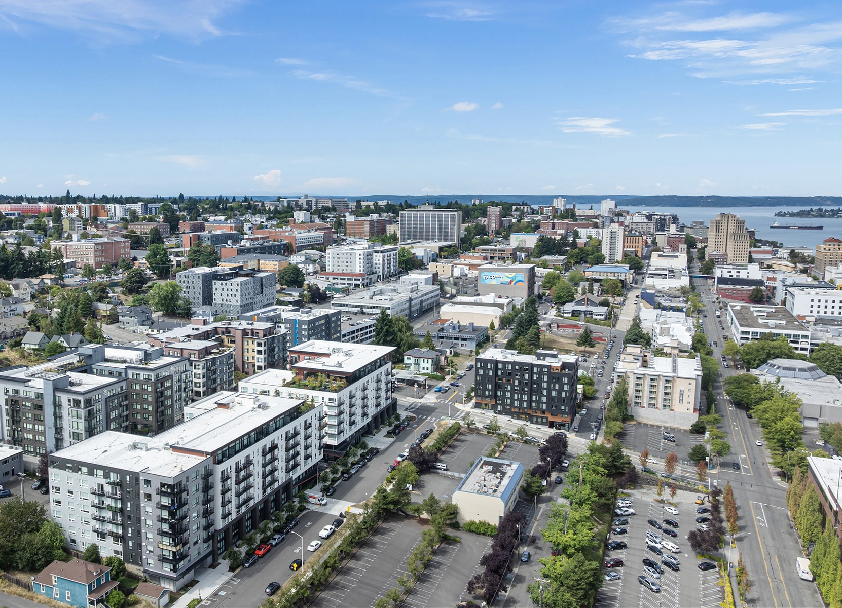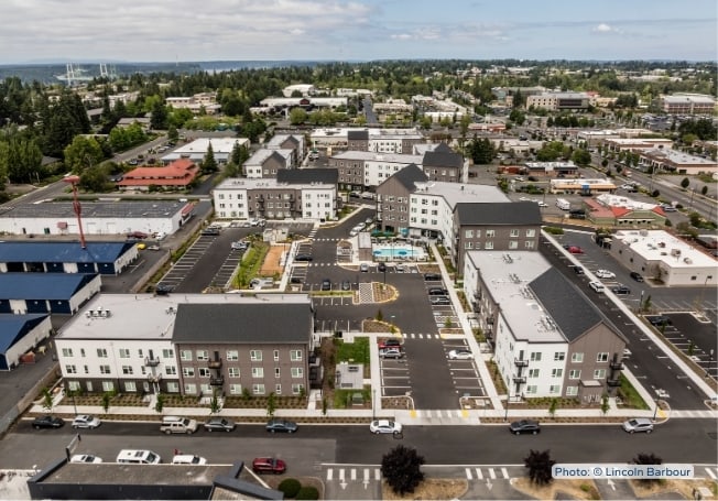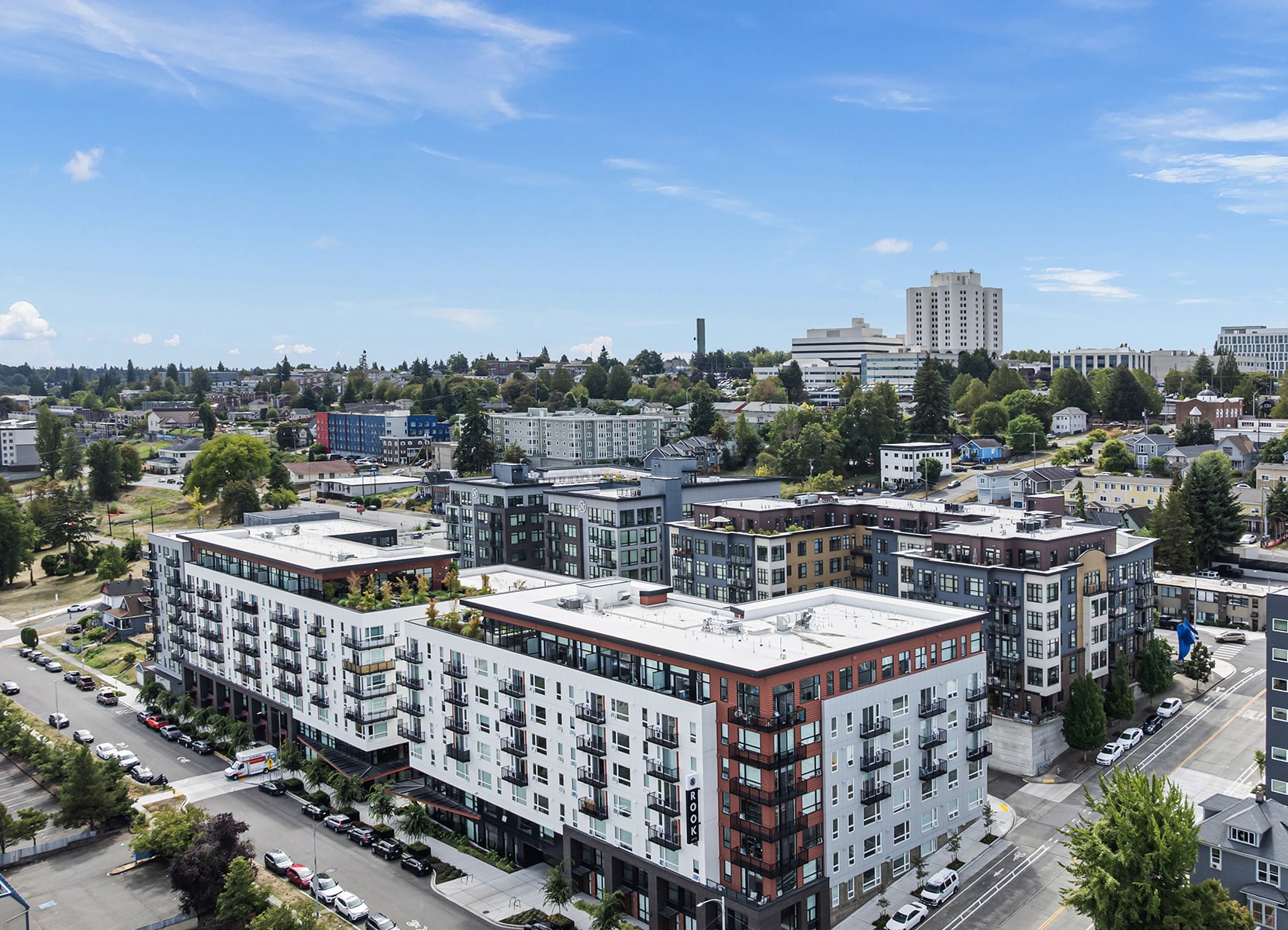 Mixed-use buildings featuring lush courtyards, rooftop decks, and below-grade structured parking in Downtown Tacoma