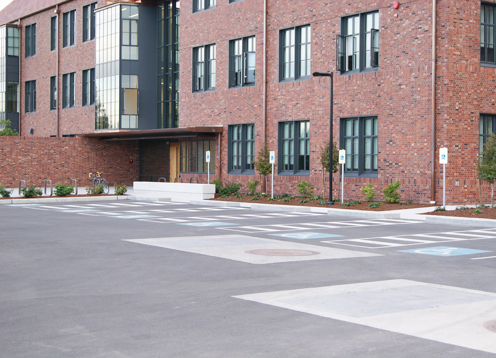 AHBL’s civil engineering scope included design of water, fire, and sewer services including a new 8-inch private fire main loop to provide adequate fire protection. We coordinated with the mechanical engineer for the placement of the ground source heating system wells and with the landscape architect for the grading and drainage structures in the Outdoor Mobility Park. For overall accessibility, an emphasis was placed on ADA due to the unique nature of the building. To make the building accessible and available to all users, grades were adjusted to eliminate steps wherever possible.